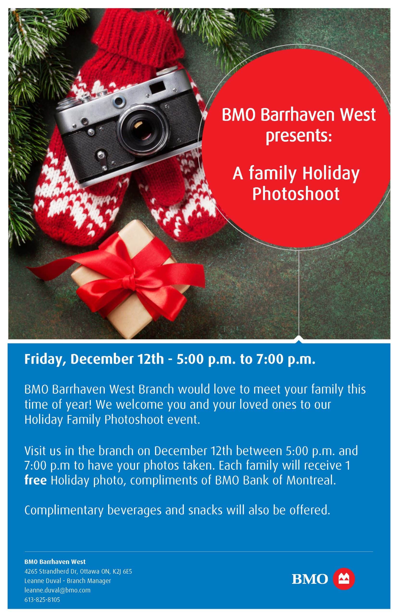 Join the BMO Barrhaven West Team for a festive event featuring a FREE photo with Santa. Bring your family and friends and make this season magical.