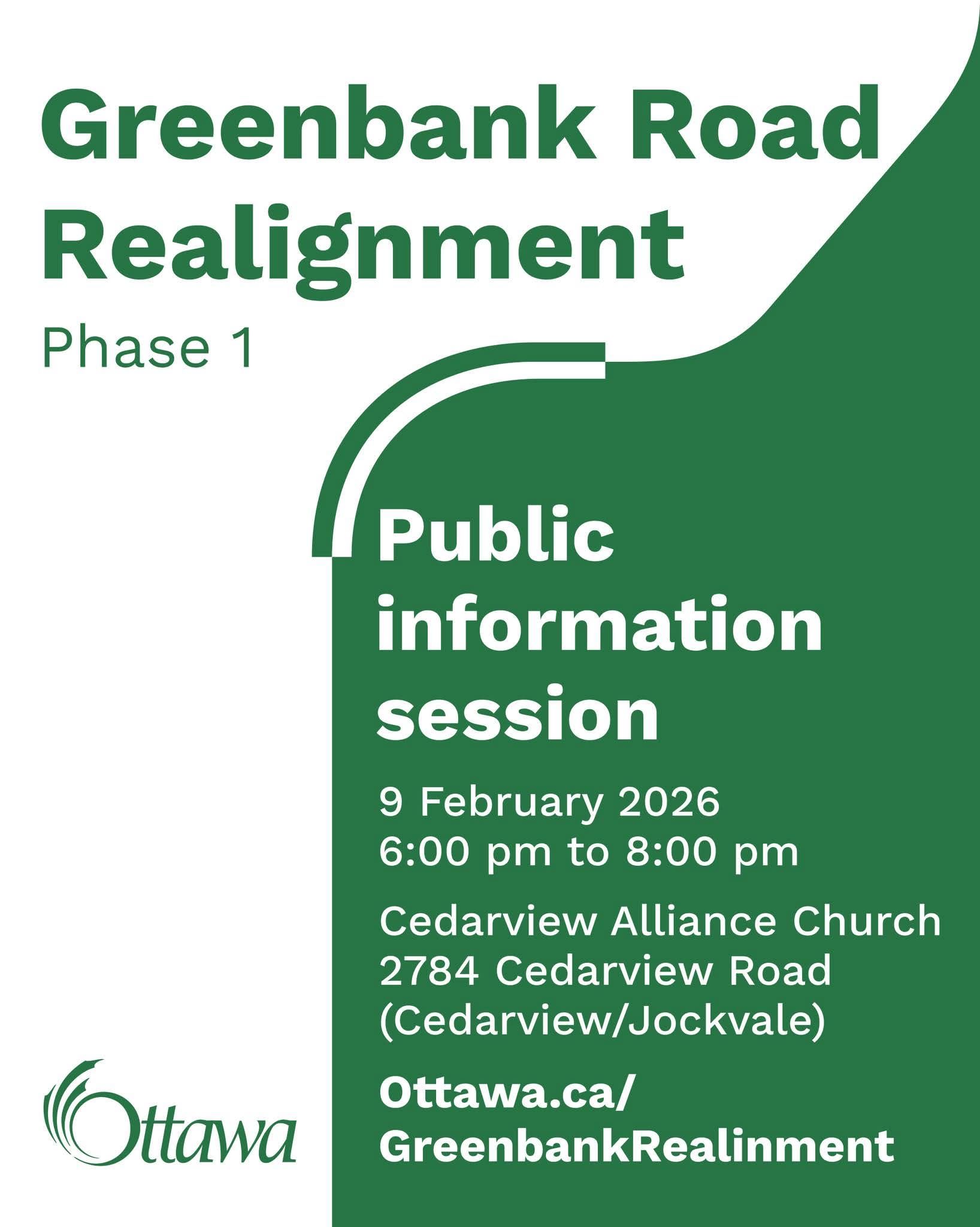 The City of Ottawa will present details regarding Phase 1 of the Greenbank Road Realignment and Southwest Transitway Extension project.
