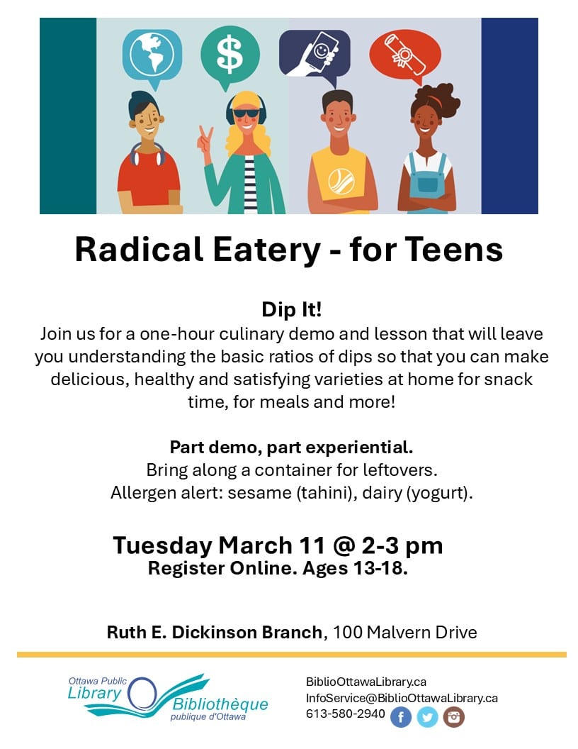 Join us for a one-hour culinary demo and lesson that will leave you understanding the basic ratios of dips so that you can make delicious, healthy and satisfying varieties at home for snack time, for meals and more! We’ll use plant-based ingredients to prepare a few different flavours and styles, and sharpen our knife skills by prepping a few vegetables to try them with!