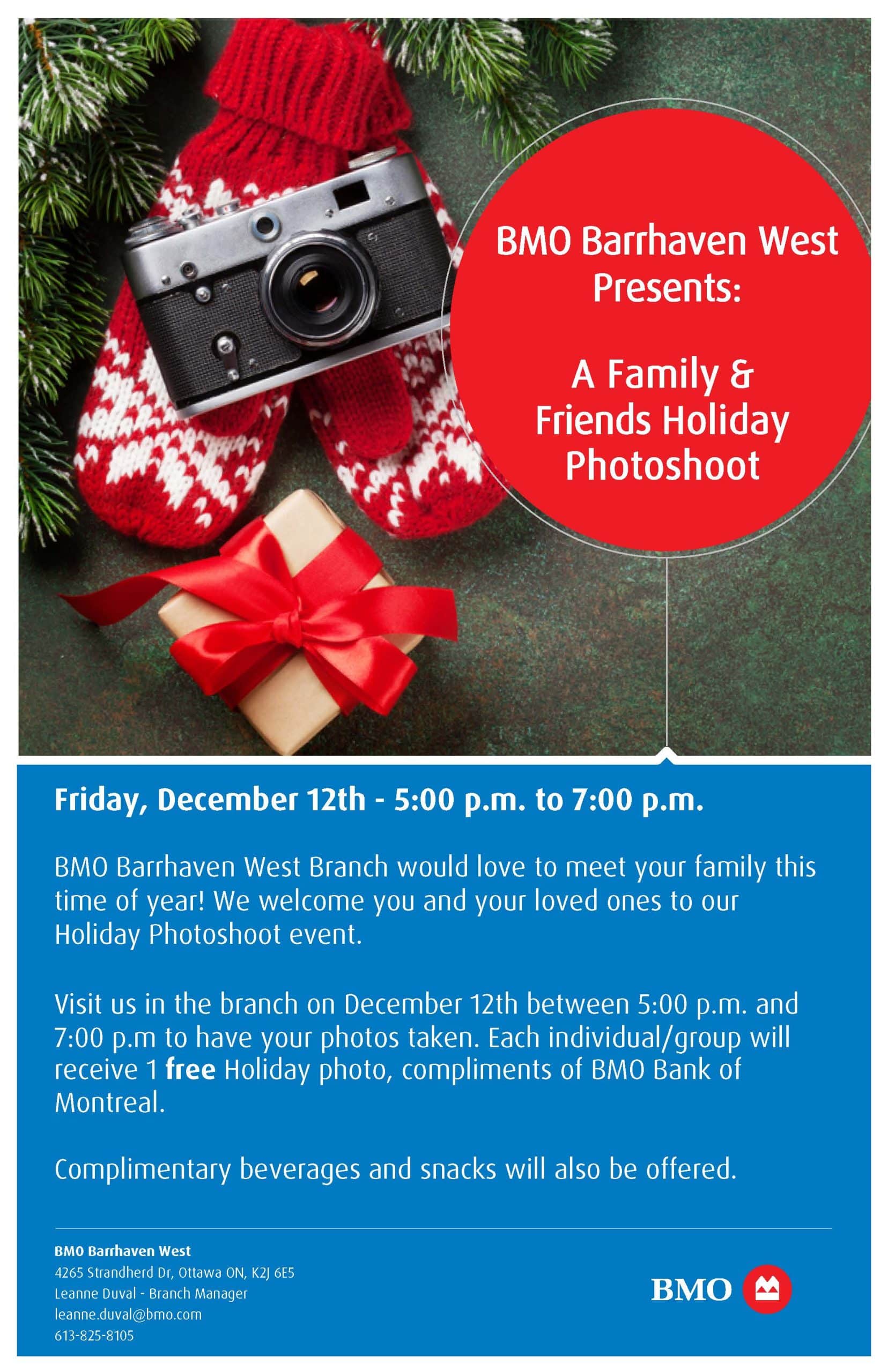 Join the BMO Barrhaven West Team for a festive event featuring a FREE photo with Santa. Bring your family and friends and make this season magical.